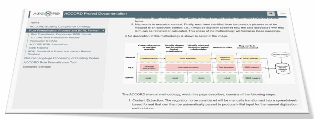 The ACCORD D2.4 Semantics Documentation provides the technical description of the artefacts created in WP2 to enable machine-readable, automated compliance checking for digital building permits. It documents the AEC3PO ontology (a unified model for regulations and permitting), the digitisation process for converting human-readable regulations into structured formats, the Rule Formalisation Tool (RFT), the Building Compliance Rule Language (BCRL), and the use of Ontotext GraphDB for semantic storage (including Semantic bSDD and data from the German Tegel case). It also details AI-based tools like SNOWTEC for information extraction, the CODE-ACCORD dataset, and the RASE-LLM approach that leverages large language models to automatically annotate regulatory texts in YAML-LD. The deliverable emphasises open-source access, FAIR principles, and usability for AEC professionals and researchers, providing both documentation and code repositories to support reuse, extension, and integration into compliance microservices.